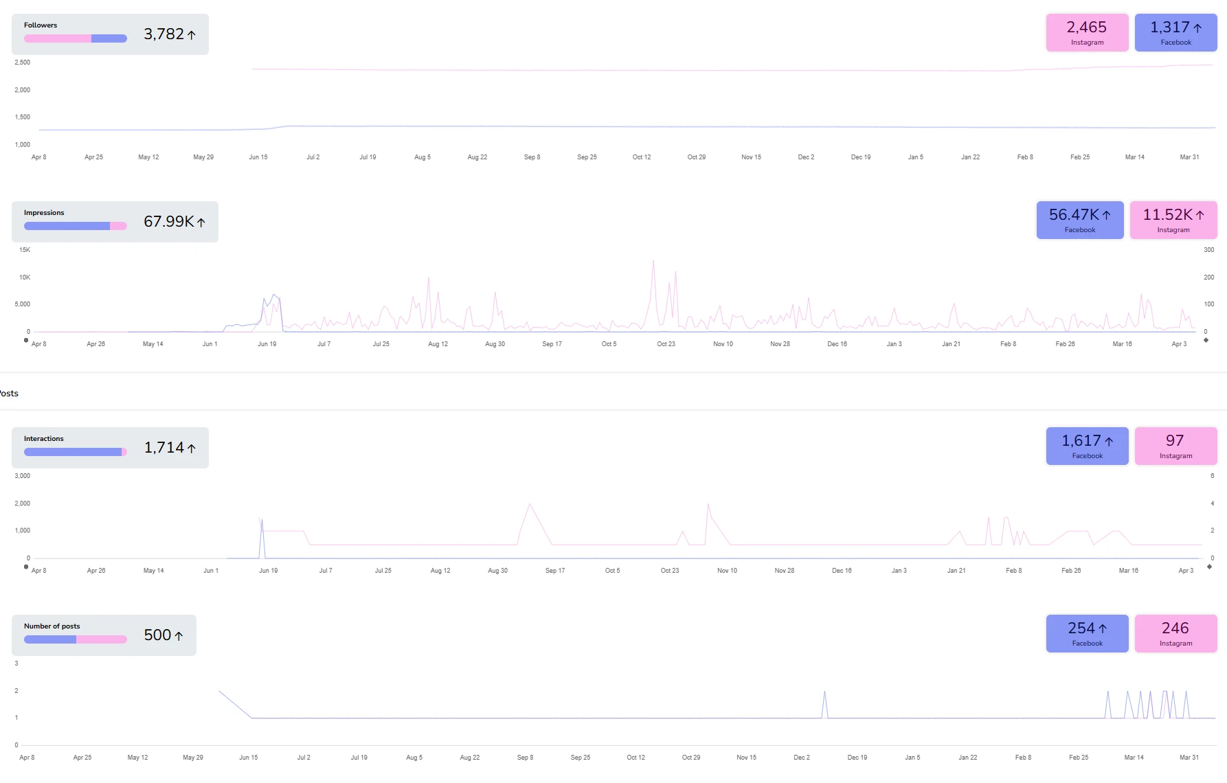 BMAD also supported Crystal Cove's Facebook and Instagram presence. Across both platforms, the brand reached 3,782 followers, generated 67.99K impressions, delivered 1,714 interactions, and published 500 posts.
